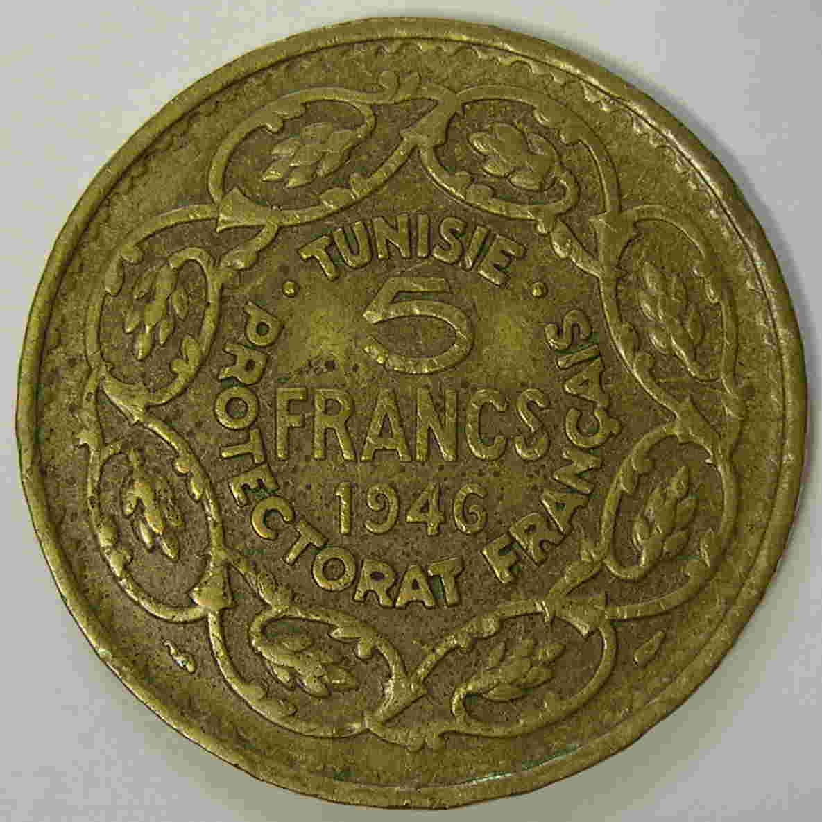 Referencia:11427 TUNEZ. 5 FRANCOS. 1946. "MUHAMMAD AL-AMIN". KM 273. MBC a MBC+. ALUMINIO-BRONCE