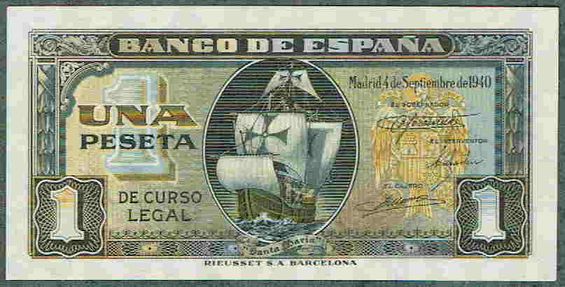 Referencia:11615 PESETA. EMISIÓN 4 DE SEPTIEMBRE DE 1940. SIN SERIE. "NAO SANTA MARÍA".Alguna marquita. SC