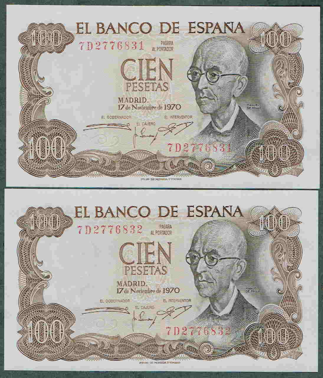 Referencia:11700 100 PESETAS. EMISIÓN 17 DE NOVIEMBRE DE 1970. PAREJA. SERIE 7D. "MANUEL DE FALLA". SC