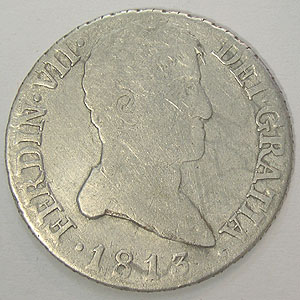 Referencia:133 FERNANDO VII. 2 REALES. 1813. G.J. MADRID. Desgastes,limpiada. BC a BC+. PLATA