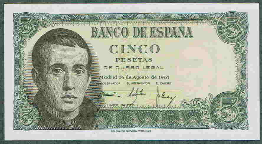 Referencia:1816 5 PESETAS. EMISIÓN 16 DE AGOSTO DE 1951. SERIE W. "JAIME BALMES". SC