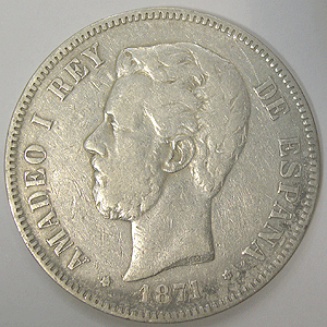 Referencia:215 AMADEO I. 5 PESETAS. 1871. 18*74. 1 de estrella flojo. BC+. PLATA