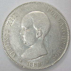 Referencia:2945 ALFONSO XIII. 5 PESETAS. 1888. 18*88. M.P.M. Golpecitos canto,parte de brillo original. EBC-. PLATA