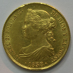 Referencia:3060 ISABEL II. 100 REALES. 1858. MADRID. Parte brillo original.Golpe en canto.. EBC-. ORO