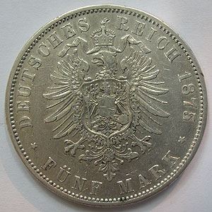 Referencia:3130 ALEMANIA-WURTTEMBERG. 5 MARCOS. 1875. F. "BUSTO KARL". KM 623. MBC+. PLATA