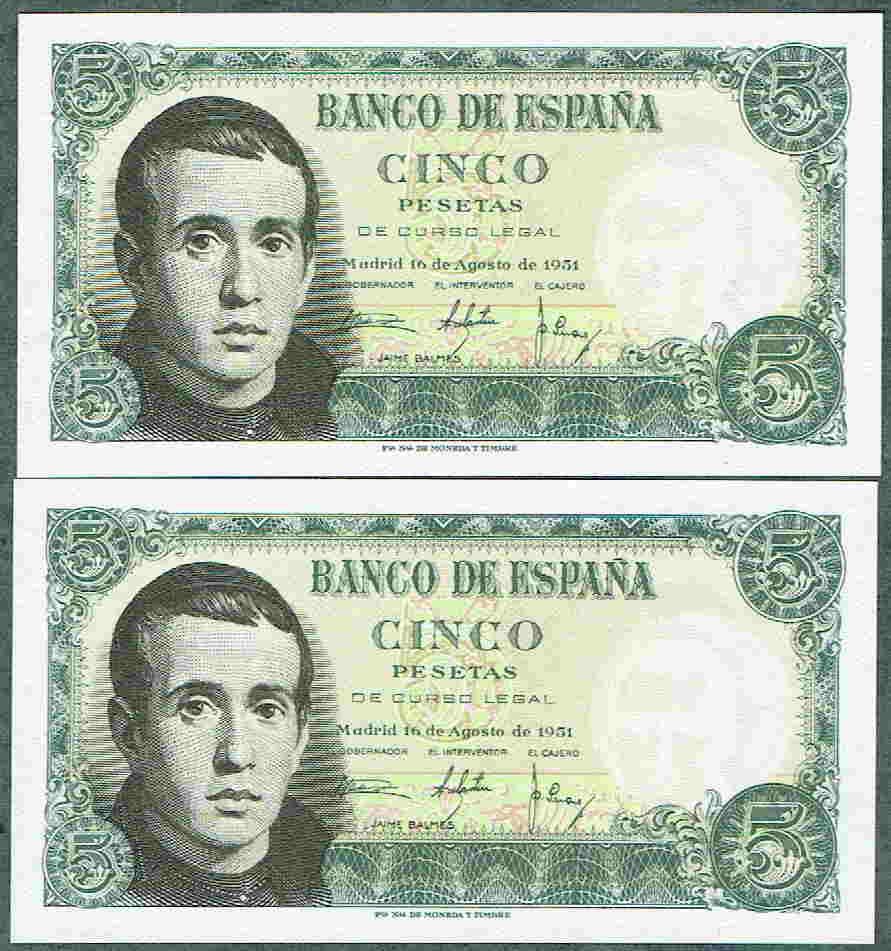 Referencia:3325 5 PESETAS. EMISIÓN 16 DE AGOSTO DE 1951. PAREJA. SERIE F. "JAIME BALMES". SC
