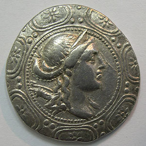 Referencia:3495 MACEDONIA. 158-149. TETRADRACMA. AMFIPOLIS.Anv:Escudo macedonio en el centro busto de Artemisa Tauropolos con arco y carcaj al hombro. Rev:Clava tumbada ,todo en corona de roble ,rayo a izda.. MBC+. PLATA