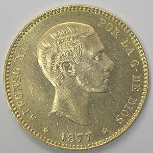 Referencia:3703 ALFONSO XII. 25 PESETAS. 1877. 18*77. Brillo original,diminuta cruz marcada debajo estrella derecha. EBC+. ORO