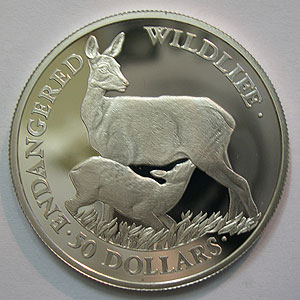 Referencia:3750 I. COOK. 50 DOLARES. 1991. "W.W.F.- CIERVA CON CRIA". KM 123. PRF. PLATA