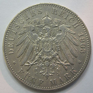 Referencia:3829 ALEMANIA-PRUSIA. 5 MARCOS. 1903. A. "GUILLERMO II".Insignificantes golpecitos canto. KM 523. MBC a MBC+. PLATA