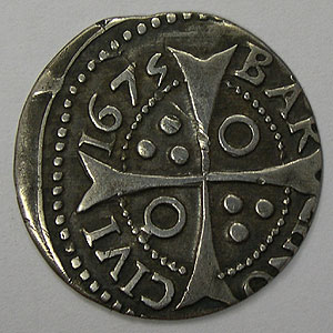 Referencia:4528 CARLOS II. CROAT. 1675. BARCELONA. Anverso difuminado por defecto de acuñación. MBC+. PLATA