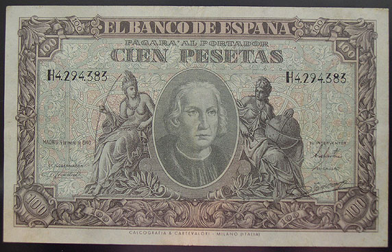 Referencia:4723 100 PESETAS. EMISIÓN 9 DE ENERO DE 1940. SERIE H. "CRISTOBAL COLON". MBC