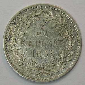 Referencia:4994 ALEMANIA-BADEN. 3 KREUZER. 1868. "ESCUDO". KM 246. EBC. PLATA