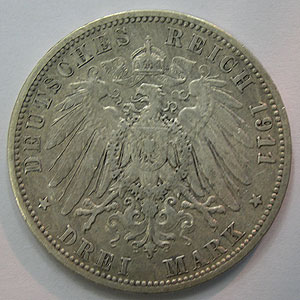 Referencia:5017 ALEMANIA-PRUSIA. 3 MARCOS. 1911. A. "GUILLERMO II". KM 527. MBC- a MBC. PLATA