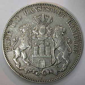 Referencia:5302 ALEMANIA-HAMBURGO. 5 MARCOS. 1902. J. "LEONES CON ESCUDO". KM 293. MBC a MBC+. PLATA