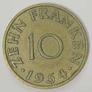 Referencia:5495 SAARLAND (EL SARRE). 10 FRANKEN. 1954. "ESCENA INDUSTRIAL". KM 1. MBC+. ALUMINIO-BRONCE