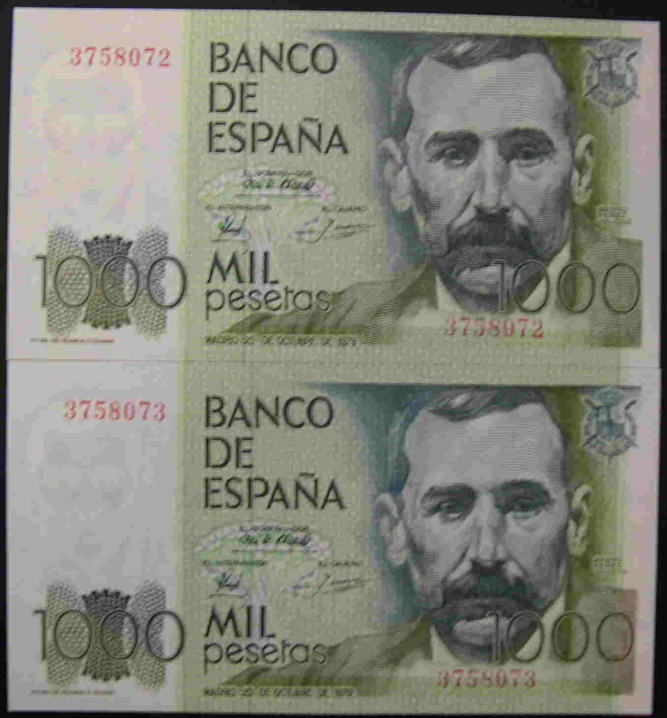 Referencia:5737 1.000 PESETAS. EMISIÓN 23 DE OCTUBRE DE 1979. PAREJA. SIN SERIE. "PERÉZ GALDÓS".Marca central de faja de taco, sin doblez. SC