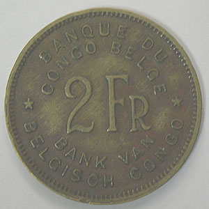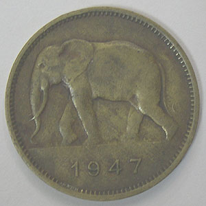 Referencia:6335 CONGO BELGA. 2 FRANCOS. 1947. "ELEFANTE".Golpecito canto,color oscuro. KM 28. MBC- a MBC. LATON