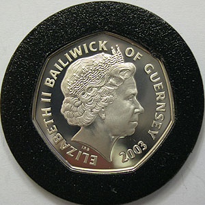Referencia:6743 GUERNSEY. 50 PENIQUES. 2003. "50 ANIVERSARIO CORONACIÓN ISABEL II-REINA EN TRONO". KM 146.a. PRF. PLATA