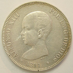 Referencia:6879 ALFONSO XIII. 5 PESETAS. 1891. 18*91. Restos de brillo original,pequeño corte en canto. EBC-. PLATA