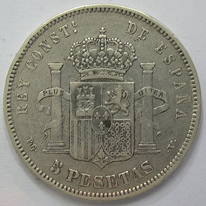 Referencia:6907 ALFONSO XIII. 5 PESETAS. 1893. 18*93. P.G.V. Estrellas muy flojas,se aprecian muy poco. BC+. PLATA