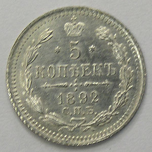 Referencia:7361 RUSIA. 5 KOPECS. 1892. "AGUILA BICÉFALA".Brillo original. KM Y-19a.1. SC-. PLATA