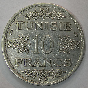 Referencia:7404 TUNEZ. 10 FRANCOS. 1934. "RASGOS". KM 262. MBC+. PLATA
