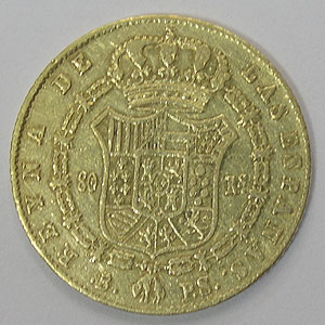 Referencia:7780 ISABEL II. 80 REALES. 1845. P.S. BARCELONA. Golpecitos canto y hojitas en anverso. MBC-. ORO