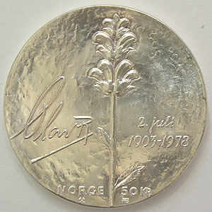 Referencia:7863 NORUEGA. 50 CORONAS. 1978. "75 ANIV. DE OLAV V". KM 424. SC. PLATA