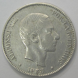 Referencia:7905 ALFONSO XII. 50 CENTAVOS DE PESO. 1883. MANILA. Exceso de metal en anverso encima fecha y golpecitos canto. MBC-. PLATA
