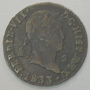 Referencia:7966 FERNANDO VII. 2 MARAVEDIS. 1833. SEGOVIA. BC+ a MBC-. COBRE