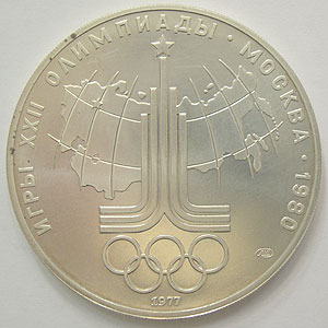 Referencia:8992 RUSIA. 10 RUBLOS. 1977. "OLIMP. MOSCU 1980-MAPA CON AROS OLÍMPICOS". KM 150. SC. PLATA