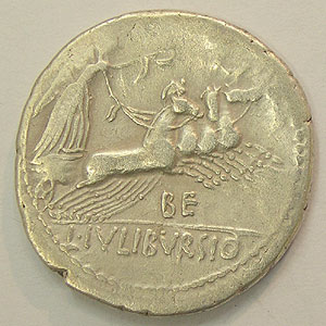 Referencia:9085 REPUBLICA ROMANA. JULIA. DENARIO. Anv:Apolo alado laureado detras tridente y anfora. Rev:Victoria en cuadriga BE.L.IULI.BURSIO. MBC. PLATA