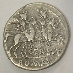 Referencia:9099 REPUBLICA ROMANA. TERENTIA. DENARIO. Anv:Cabeza galeada de Roma,detrás Victoria con láurea y X. Rev: C.TER.LVC.ROMA.Los Dióscuros cabalgando con lanza.. MBC. PLATA