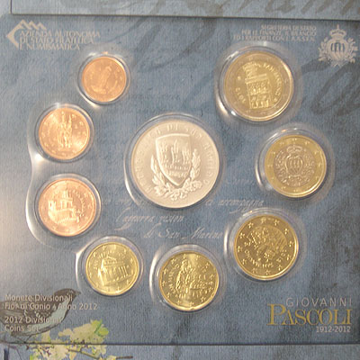Referencia:9202 SAN MARINO. EURO. 2012. Cartera oficial con 1-2-5-10-20-50 Céntimos y 1-2 Euros y 5 Euros plata (GIOVANNI PASCOLI). SC. VARIOS METALES