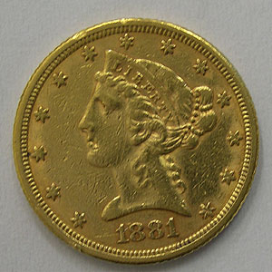 Referencia:922 E.E.U.U.. 5 DOLARES. 1881. "CORONET" Golpecitos canto. KM 101. MBC+. ORO