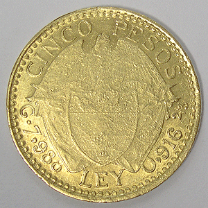 Referencia:9569 COLOMBIA. 5 PESOS. 1919. Desgastes anverso y reverso.Ha podido servir como joya aunque no tiene ninguna marca.Infimos golpecitos canto. KM 195.1. MBC-. ORO