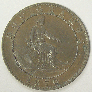 Referencia:9947 GOBIERNO PROVISIONAL. 2 CÉNTIMOS DE PESETA. 1870. Infima manchita en reverso. MBC+. COBRE